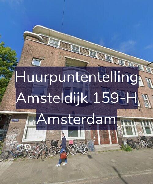 Hieronder de minimale WWS puntentelling voor Amsteldijk 159-H uitgesplitst per categorie: gebruiksoppervlakte vertrekken, aantal verwarmde vertrekken, keuken en sanitair kwaliteit, buitenruimte, WOZ-waarde en energielabel.