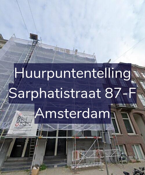 Hieronder de minimale WWS puntentelling voor Sarphatistraat 87-F uitgesplitst per categorie: gebruiksoppervlakte vertrekken, aantal verwarmde vertrekken, keuken en sanitair kwaliteit, buitenruimte, WOZ-waarde en energielabel.